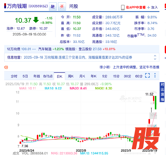 经历了连续大涨后,于9月19日更出现-9.98%的剧烈下挫,收报10.37元,总市值343.80亿元。